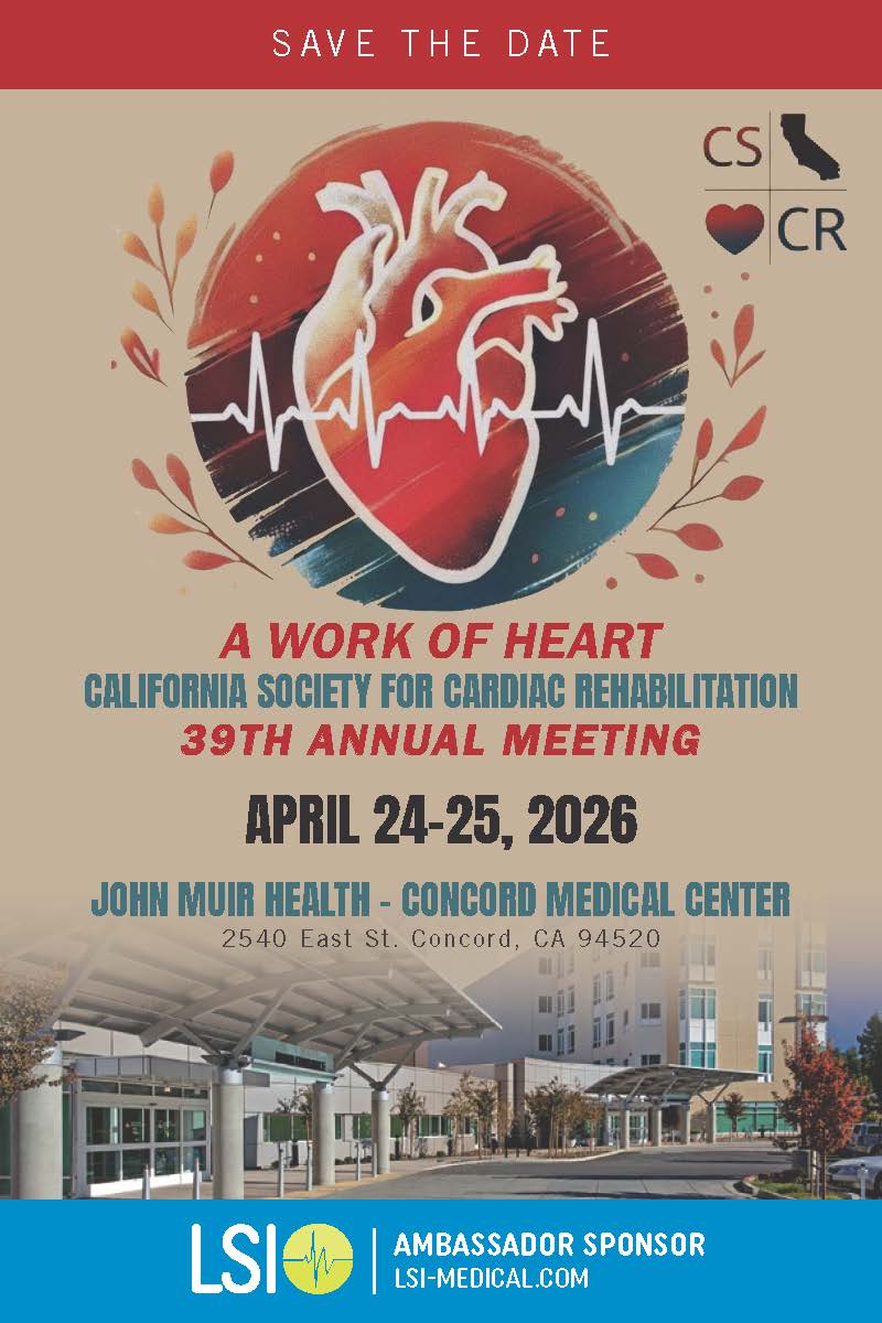 We are pleased to invite you to save the date for the California Society for Cardiac Rehabilitation (CSCR) 39th Annual Meeting, A Work of Heart, taking place April 24–25, 2026 at John Muir Hospital in Concord, CA.![]()